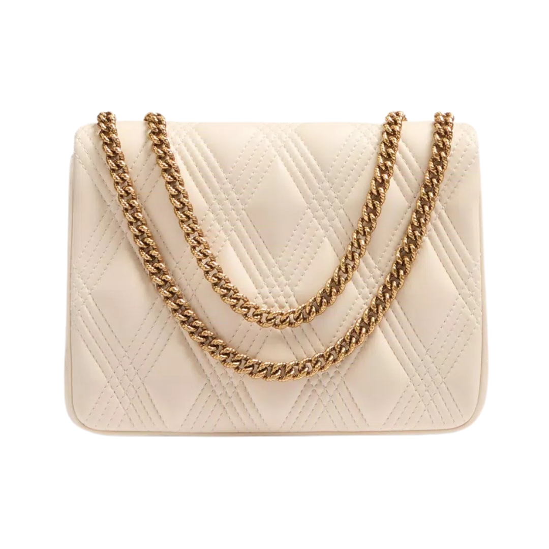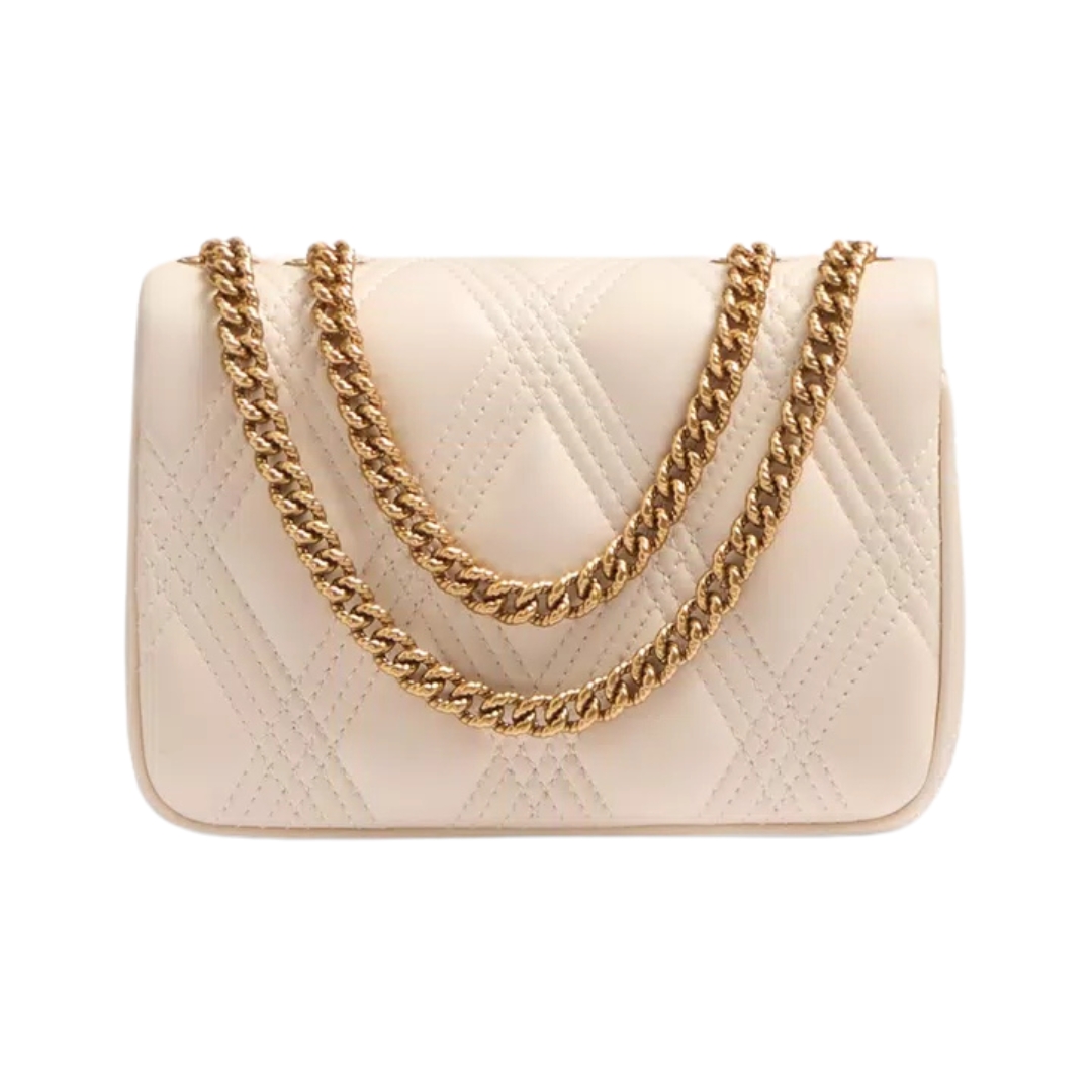 Dimensioni:● Larghezza: 23 cm● Altezza: 15 cm● Profondità: 7 cm Dettagli:● Materiale: Nappa trapuntata● Colore: Avorio● Chiusura: Patta con chiusura