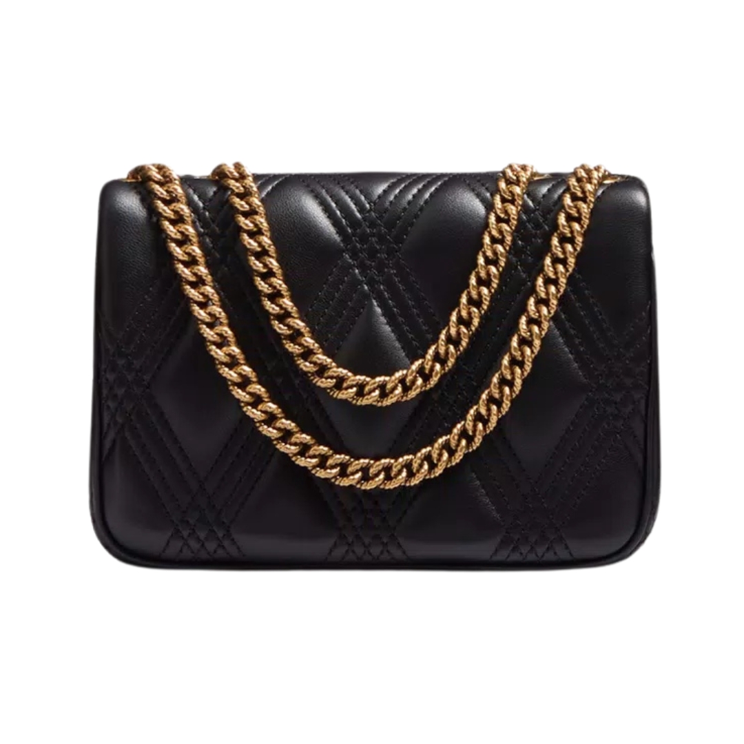 Dimensioni:● Larghezza: 23 cm● Altezza: 15 cm● Profondità: 7 cm Dettagli:● Materiale: Nappa trapuntata● Colore: Nero● Chiusura: Patta con chiusura