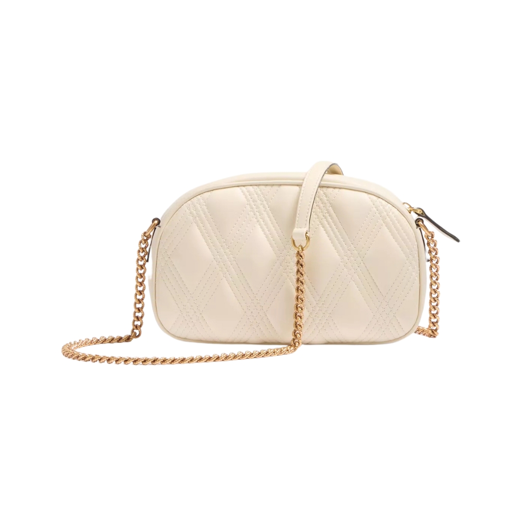 Dimensioni:● Larghezza: 24 cm● Altezza: 16 cm● Profondità: 7 cm Dettagli:● Materiale: Nappa trapuntata● Colore: Avorio● Chiusura: Zip superiore● Logo: