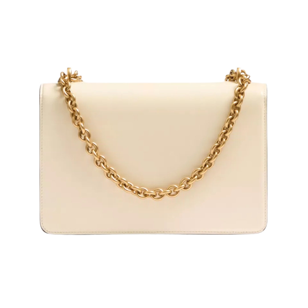 Dimensioni:● Larghezza: 24 cm● Altezza: 17 cm● Profondità: 7 cm Dettagli:● Materiale: Pelle lucida di vitello● Colore: Avorio● Chiusura: Patta