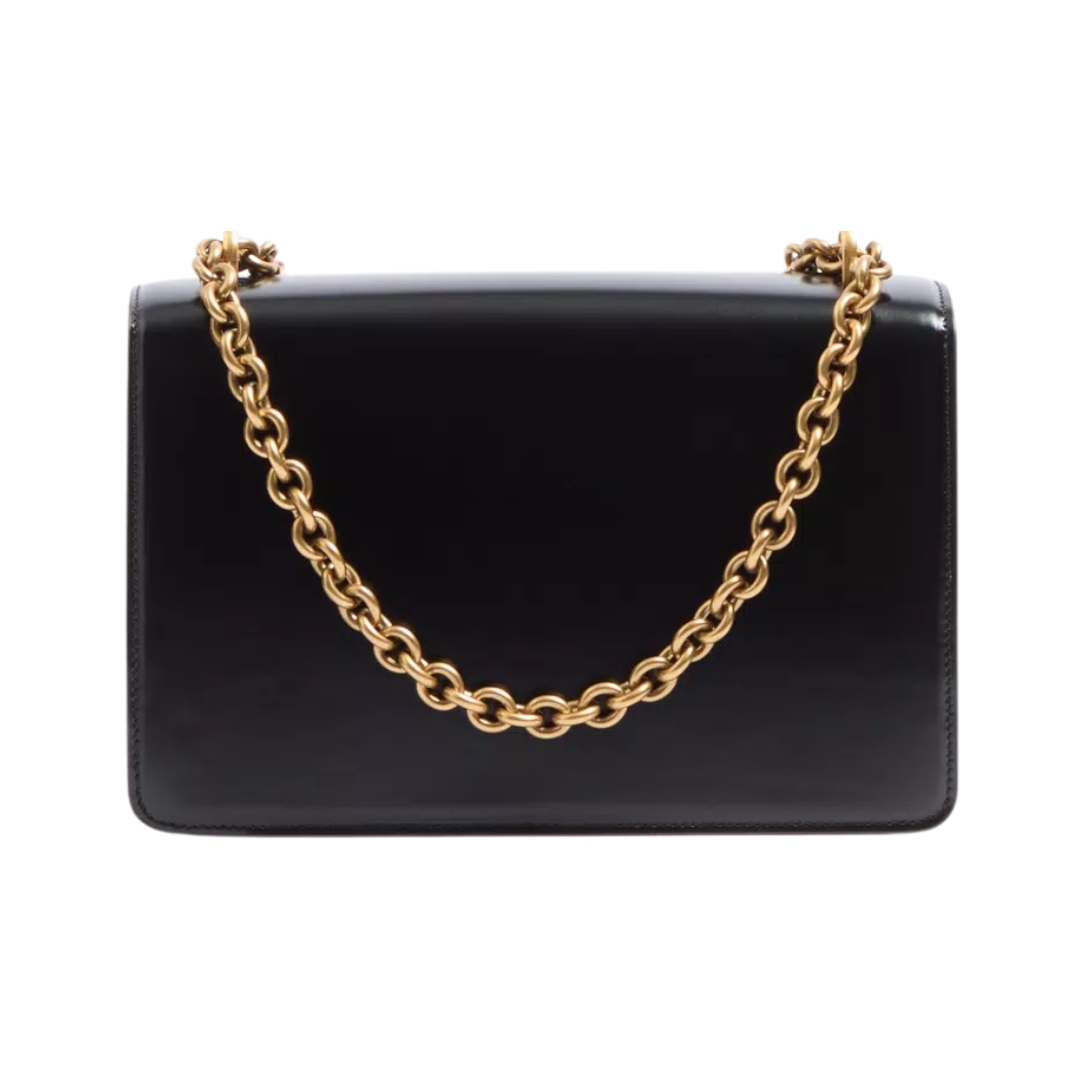Dimensioni:● Larghezza: 24 cm● Altezza: 17 cm● Profondità: 7 cm Dettagli:● Materiale: Pelle di vitello lucida● Colore: Nero● Chiusura: Patta