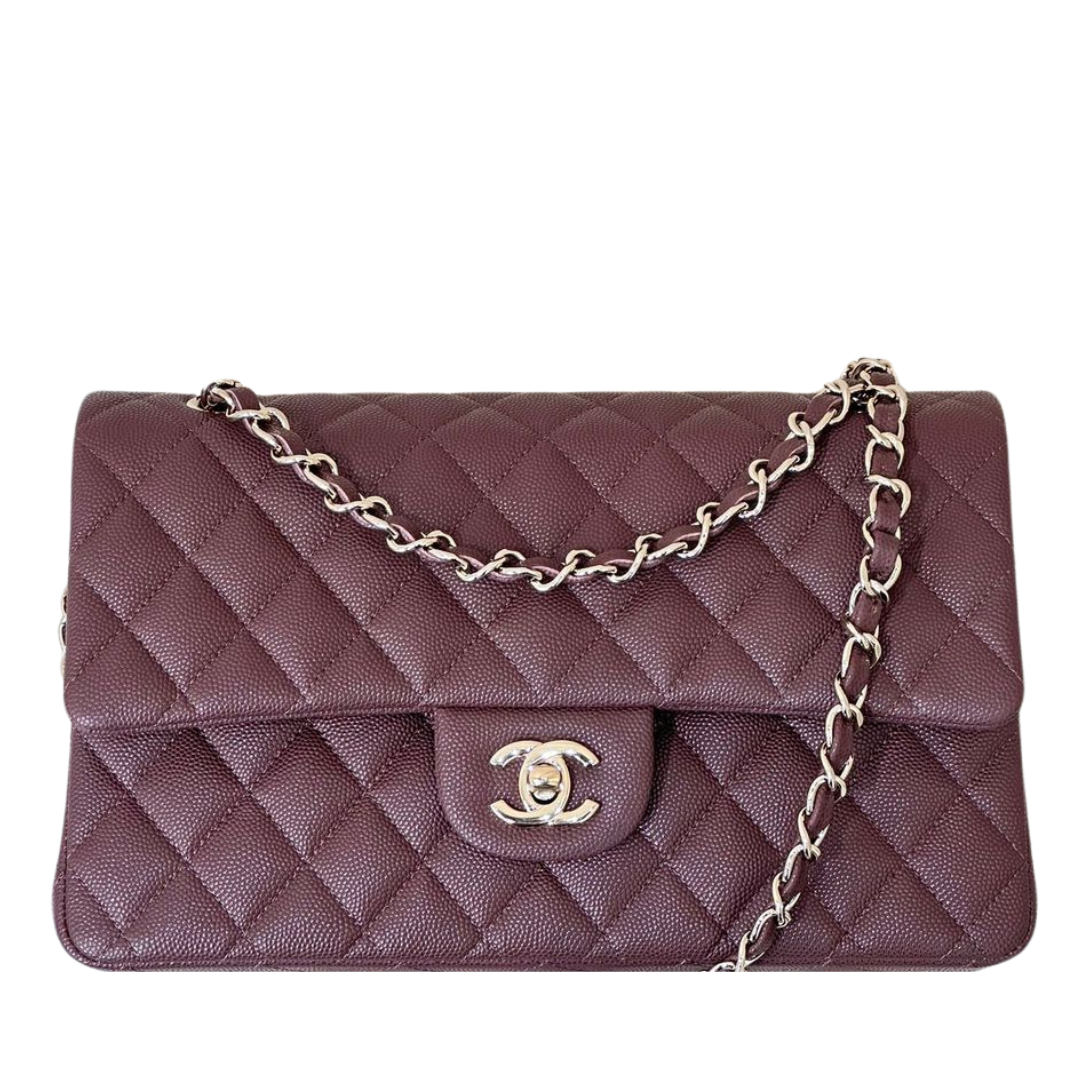 Dimensioni:● Larghezza: 25,5 cm● Altezza: 15 cm● Profondità: 6,5 cm Dettagli:● Materiale: Pelle caviar (grainé)● Colore: Bordeaux● Chiusura: Patta con
