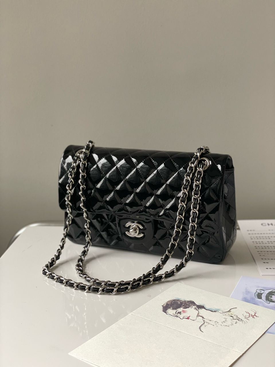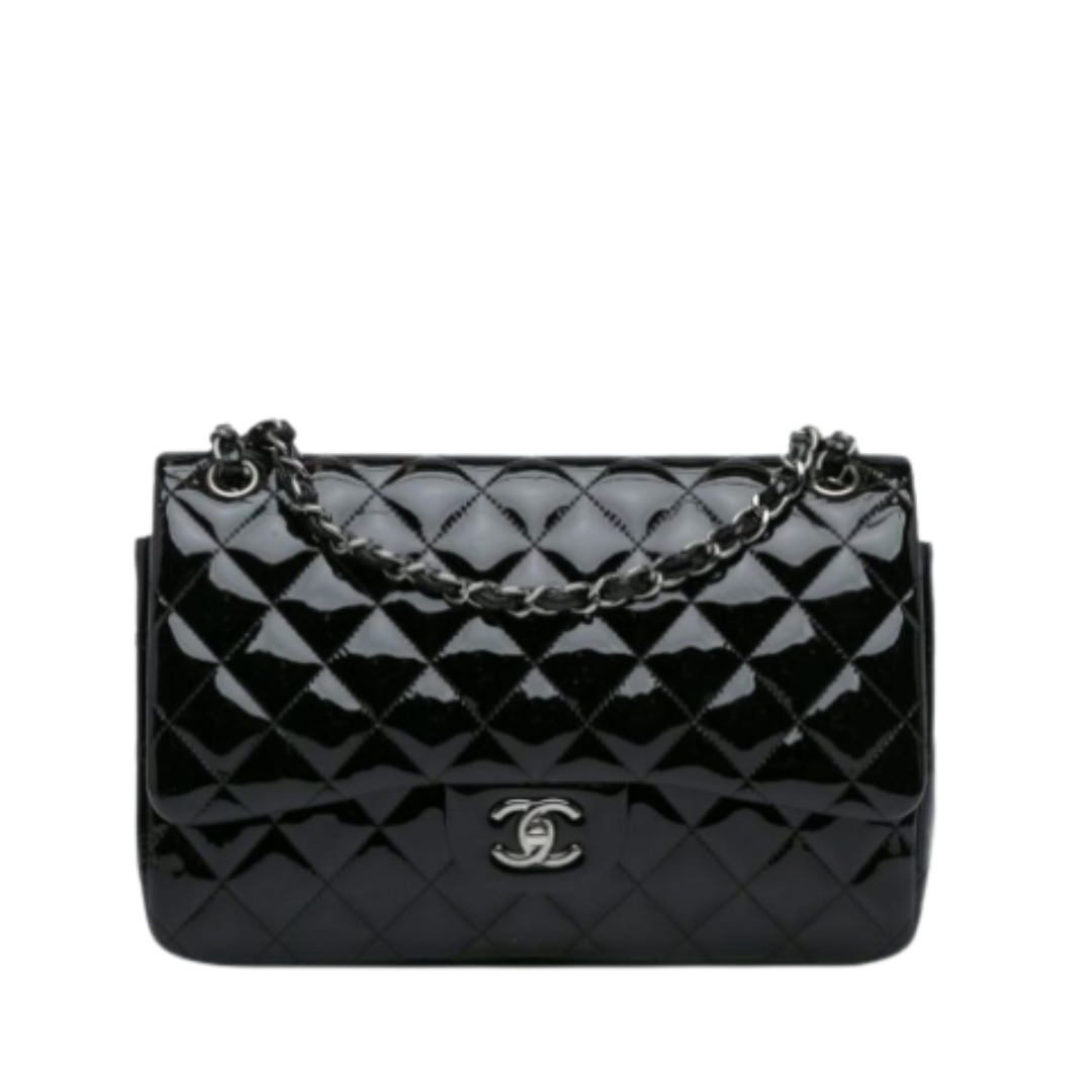 Borsa Chanel 11.12 Double Flap nera verniciata Jumbo 30 cm