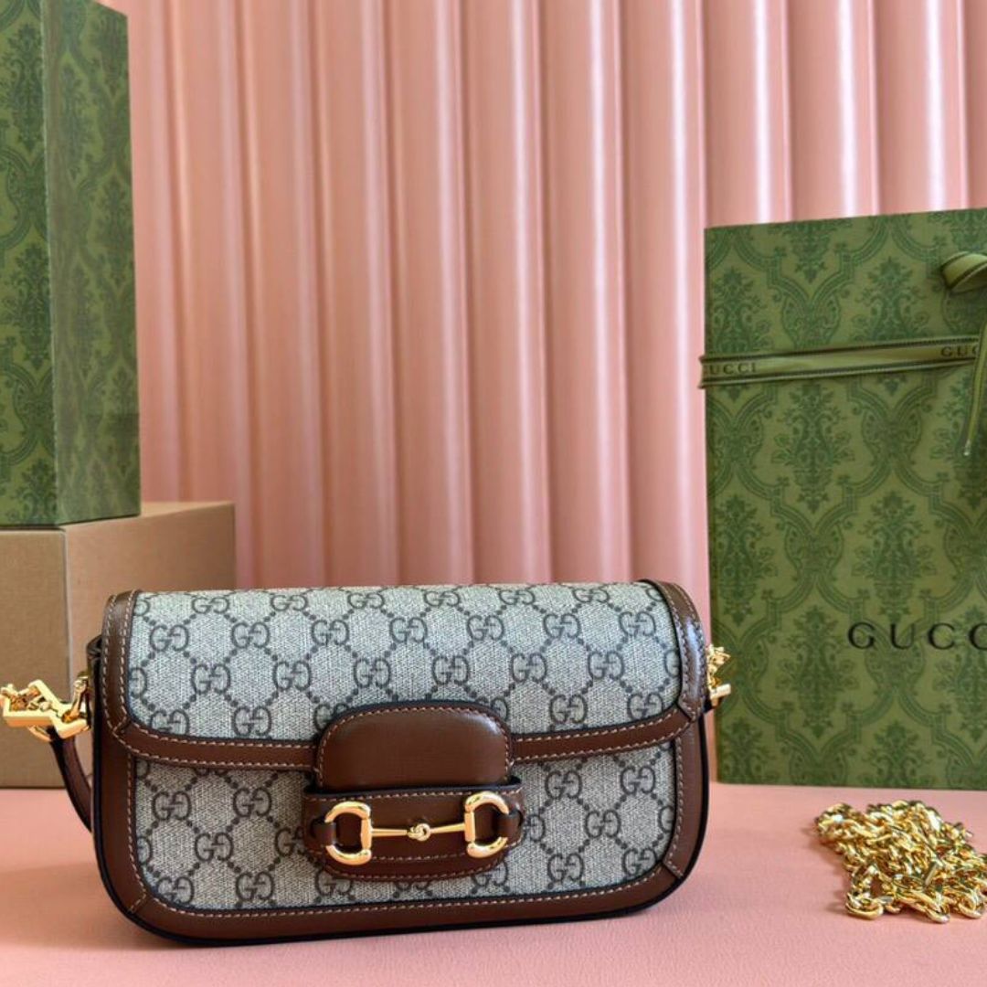 Borsa Gucci Horsebit 1955 mini in GG Supreme beige/marrone 24 cm